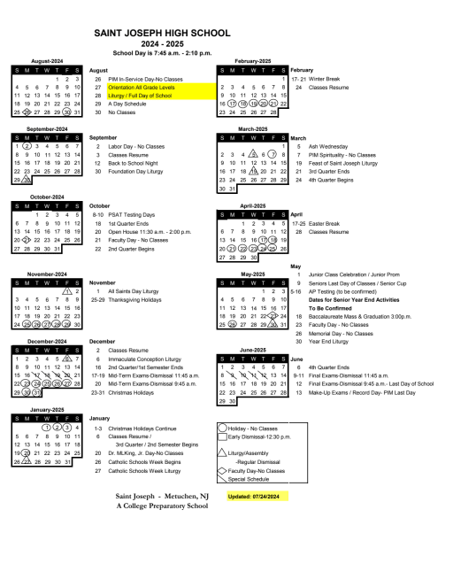 St Joseph High School Calendar 2025 – As kids get ready to head back to school, Wicomico schools will hold open houses on Aug. 27th at secondary schools and Aug. 28th for information on school leadership teams, the 2025-2025 school . The Sylvan Lake Gulls have announced the creation of a Gulls 19U Prep Team for the 2025 summer baseball season. .